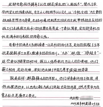 观影后,同学们纷纷发表了感言并书写了心得体会,如周聪梅同学讲道:“关于电影中不断出现且让我感触颇深的点是班长告诉战士‘不要哭’‘牺牲是不需要眼泪的’,在朝鲜的寒风暴雪中,我们的战士连哭都要忍着,眼泪是会冻住的,对于狙击手来说,这是不可以的。那样艰苦的条件下,那样年轻的生命,用他们的热血为我们铸成了钢铁长城,告诉世界一一我们这个民族是不可战胜的!”