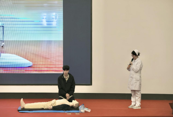 首先,姚雪梅将理论知识与实际操作相结合,为大家讲解心肺复苏术的操作方法,并结合急救包、自动除颤仪等专业设备,演示心搏骤停的处理方法,讲解其中的注意事项。接着,救护队成员杨增熊进行示范,介绍心肺复苏的黄金时间和胸外按压的部位、频率、深度等,演示胸外按压、人工呼吸等操作,将理论知识转化成操作技能,提升培训效果。