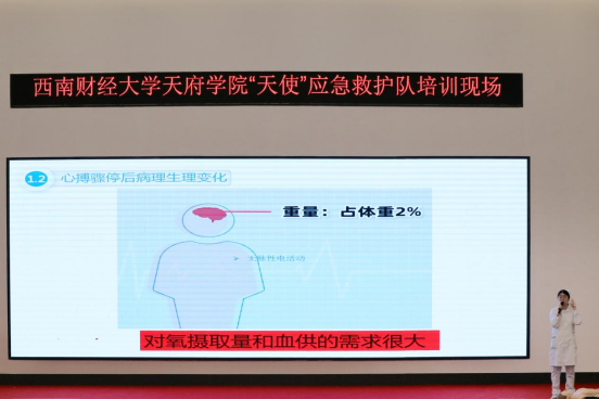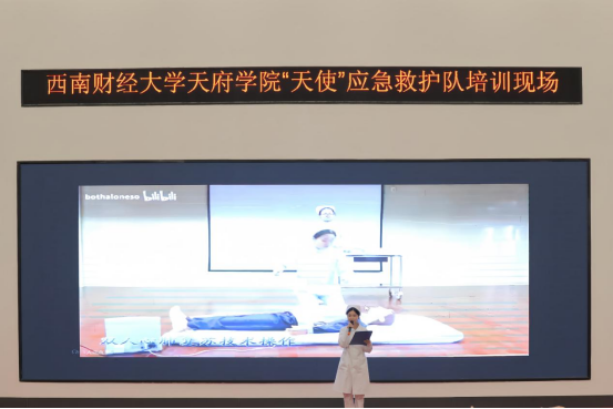4月11日,西南财经大学天府学院“天使”应急救护队在德阳校区学术报告厅开展首次救护培训。康养护理学院党总支书记陈永清,“天使”应急救护队指导老师姚雪梅、马其霞参加培训。培训由教师姚雪梅主讲,学生王三燕主持。