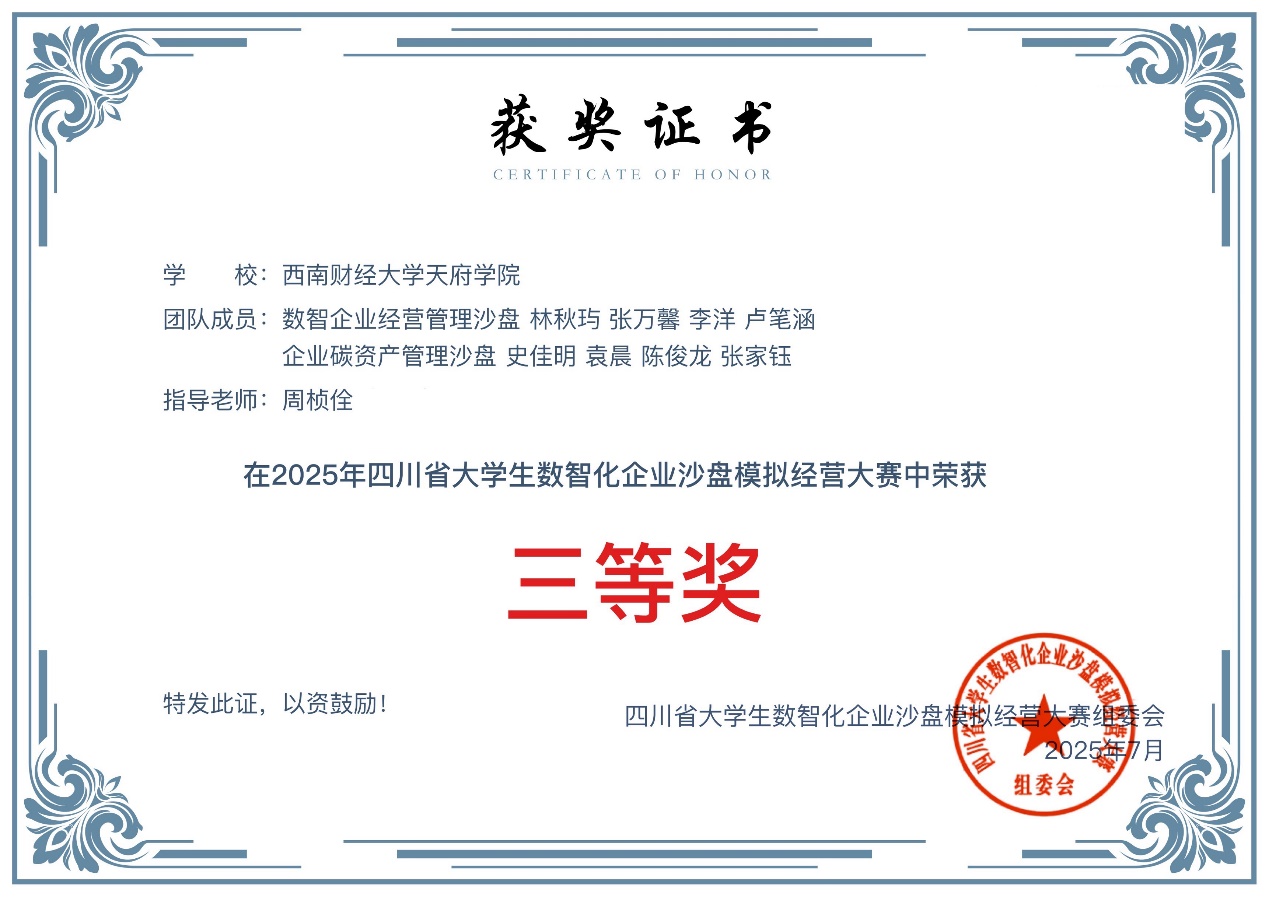 近日,由四川省教育厅主办的2025年四川省大学生数智化企业沙盘模拟经营大赛在西华大学成功举办。此次大赛将持续改进创新,以立足服务地方经济发展为宗旨,着重培养具备数智技术应用能力、经营管理思维与绿色发展理念的复合型人才,切实提升学生在数字经济浪潮下的创业、管理及协作水平。大赛吸引全国众多高校优秀学子参加,赛事在本校的开展由会计学院王叠珏老师牵头组织,最终工程与材料学院学生林秋玙、李洋、张万馨、卢笔涵、史佳明、袁晨、张家钰、陈俊龙团队在教师周桢佺的指导下荣获四川省大学生数智化企业沙盘模拟经营大赛三等奖,创赛事工科组新突破。