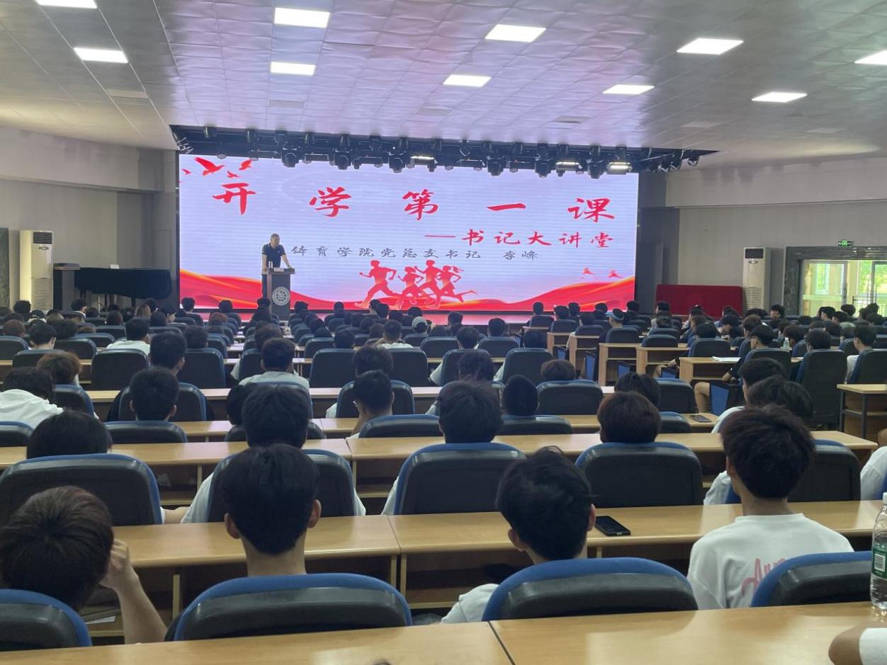 为引导新生坚定理想信念、筑牢思想根基、顺利适应大学生活,9月8日,西南财经大学天府学院体育学院在学术报告厅举办“开学第一课——书记大讲堂”活动。学院党总支书记李峰担任主讲,2025级全体新生、辅导员及相关教师共同参与本次活动。