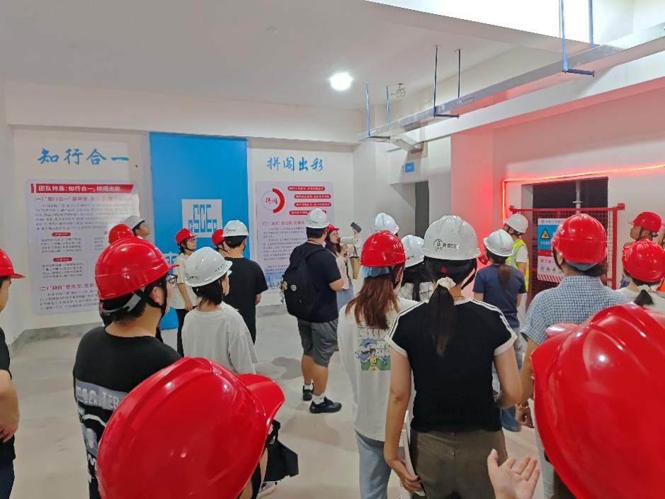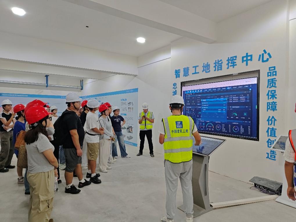 安全培训结束后,师生一行走进项目智慧建造展区。首先,现场工程师分别为同学们介绍了中建三局公司的概况、所在施工现场的项目建设进展、党建情况等。其次,带领同学们学习了项目施工现场的智慧工地智慧中心,该平台可以实时掌握项目现场的施工进度、质量、安全、采购的所有动态。