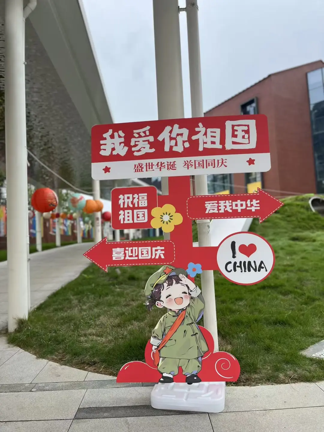 为营造热烈喜庆的国庆氛围,校园内精心布置了多处主题景观。电子显示屏上滚动播放着节日祝福与爱国主题画面,五彩的小旗帜在微风中轻扬,洋溢着欢乐的节日气息。同时,校园内还设置了多个国庆主题打卡点,吸引师生驻足留念,共同感受浓厚的家国情怀。