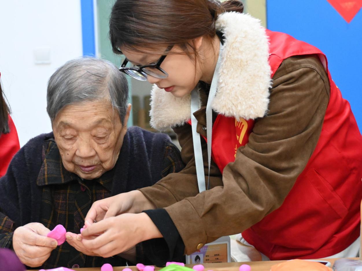 志愿者与老人们携手制作手工艺品