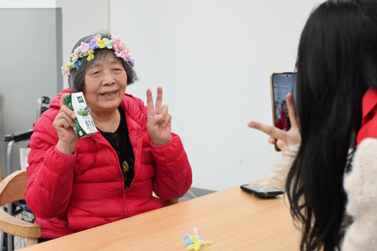 在与老人们逐渐熟悉之后,志愿者们将提前准备好的牛奶等慰问品送到老人手中,同时递上学生亲手制作的手工艺品,并协助他们佩戴手链、搭配挂饰。灵动的饰品映衬着老人们的笑容,整个现场弥漫着温馨和睦的氛围。