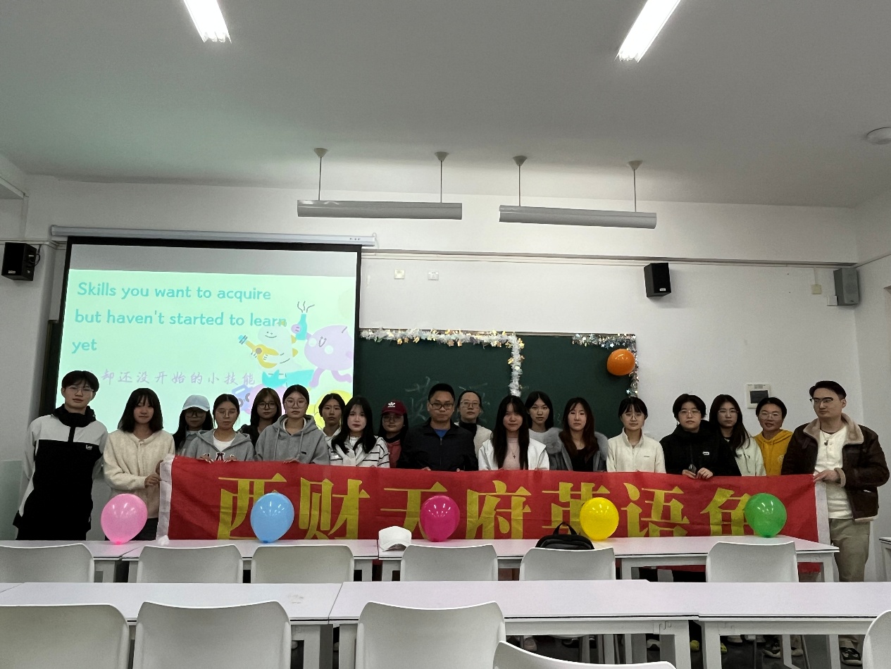 为丰富校园文化生活,提升学生英语表达与综合素养,西南财经大学天府学院德阳校区于11月13日晚在B303教室成功举办了2025年秋季学期第四次英语角活动。本次活动由文化与教育学院主办,会计学院Olive Green英语社承办,以“Skills you want to acquire but haven’t started to learn yet”(那些你想学却还未开始学的技能)为主题,邀请到文化与教育学院教师黄雅琳、罗谢雨、夏魏薇和舒洪成四位老师担任现场嘉宾,与同学们展开亲切交流。