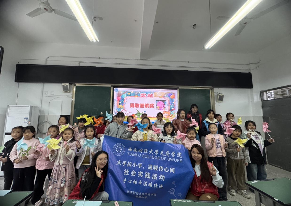 巧手裁云色,童心转叶声。11月17日,西南财经大学天府学院德阳校区第一学生社区的支教团队在鄢家小学精心组织策划了一次有趣且有意义的支教活动。本次活动以“风车”为主题,旨在通过风车制作等相关活动,培养孩子们的动手能力、创造力和想象力,同时传递关爱与温暖,激发他们对生活和学习的热情。
