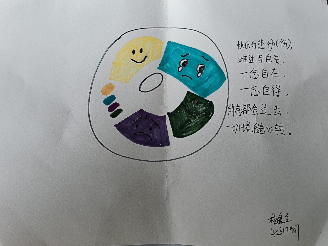 活动现场洋溢着温馨活泼的氛围,同学们纷纷执笔挥墨,将内心的喜悦、忧伤、焦虑与安宁一一投射于色彩与文字之间。画布上,线条勾勒出情感的轮廓;手抄报中,图文记录情绪的流转;散文里,字里行间透露着对自我的觉察与接纳。这里没有评判与说教,只有倾听与共鸣。每份作品附上的情绪解读,不仅是创作者对内心的梳理,也成为连接他人情感的温柔纽带。文化与教育学院杨金兰同学的作品以明快的圆形构图,搭配“一念自在,一念自得”的文字,将情绪的流转与心境的自洽具象化,暖色与沉稳色块交织碰撞,传递出“境随心转”的从容态度。翁立怡同学则通过几何分割的黑白线条,铺展神态各异的卡通形象,细腻笔触下涌动鲜活的情感表达,展现出年轻一代对内心世界的生动解构。活动接近尾声时,商业街的展板上已贴满缤纷各异的“情绪调色盘”。初冬晚风微凉,而这些真挚热烈的表达,却让空气里浸润着一片松弛的暖意。