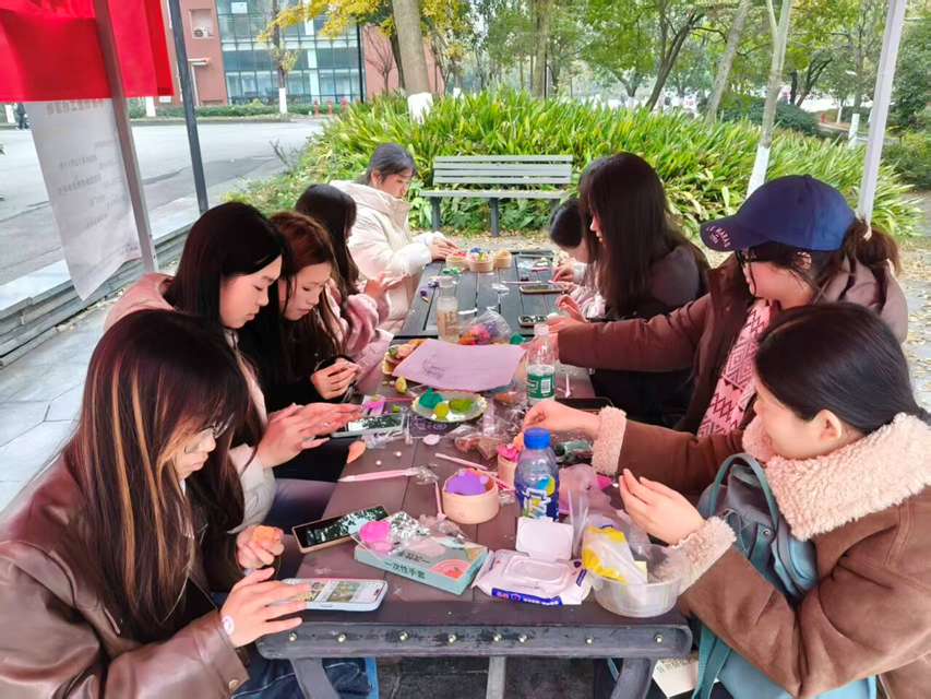 制作过程中,大家相互交流技巧、分享灵感,欢声笑语不断,轻松打破了年级与专业的界限,营造出融洽自然的交流氛围。作品完成后,同学们在专属打卡区合影留念,记录下这份独特的冬日创意与情谊。通过亲手捏制,同学们不仅在忙碌学业中放松了身心,增进了彼此情感,也深切体验和感悟到了冬至节气所蕴含的团圆与温暖的文化内涵。