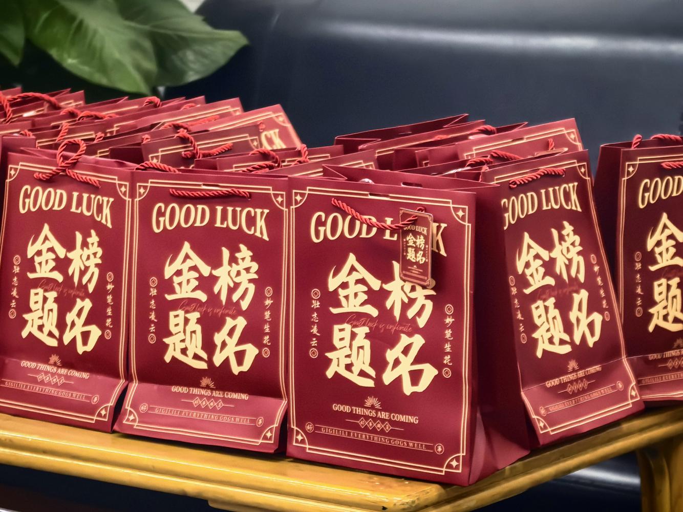 随后,陈真子带领毕业班辅导员团队走入学子中间,逐一将“金榜题名”主题暖心礼包送至学生手中,与学子们面对面倾心交流。老师们细致询问复习进度、备考难点与生活需求,叮嘱大家既要保持冲刺姿态,更要筑牢健康底线,通过科学作息校准备考状态,以沉稳心态应对考试挑战。礼包以寓意喜庆的红色手提袋承载,内含“笔锋破局”0.5mm黑色战笔、“深耕不辍”前程似锦车线本、“精准规划”未来可期便利贴、“度量理想”一帆风顺套尺及“笃行致远”心想事成贴纸包。每一件物品既兼顾备考实用属性,更蕴含学院“经世济民、孜孜以求”的育人初心,化作照亮研途的“星灯”,温暖学子前行之路。