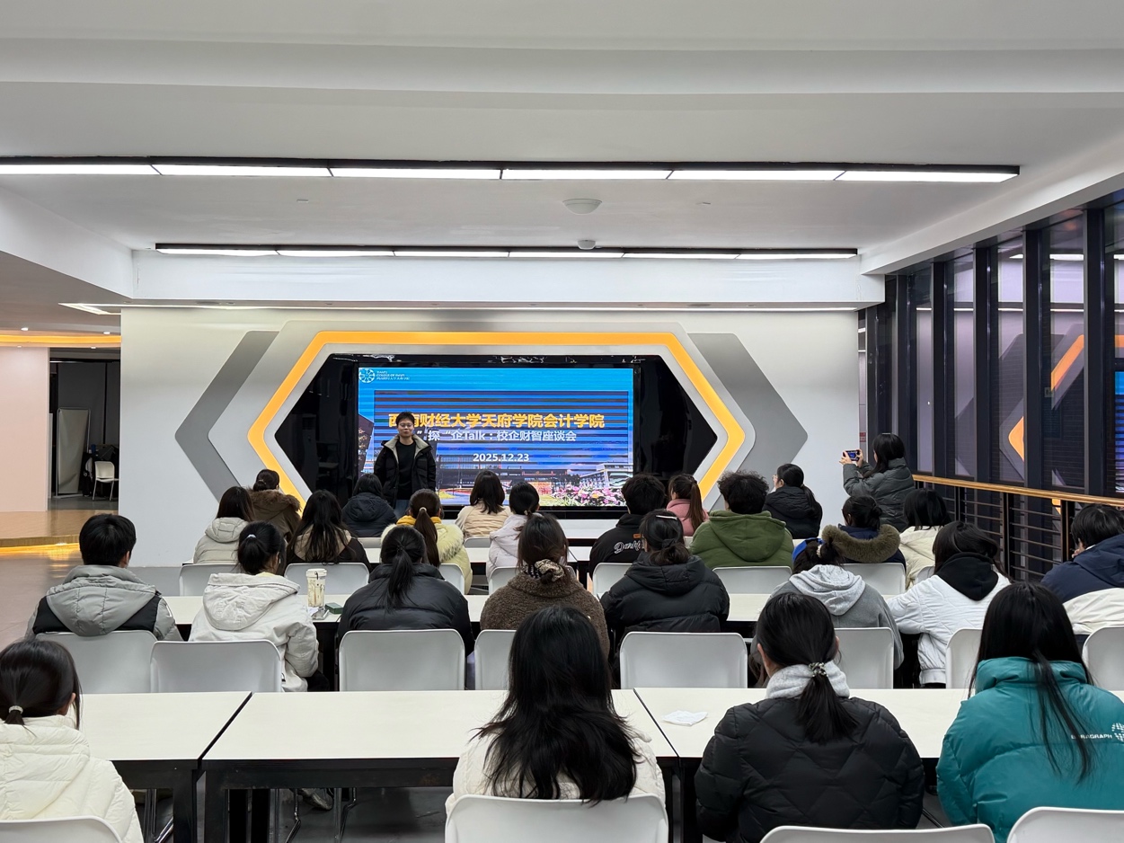 12月23日晚,会计学院在德阳校区C301财务共享中心成功举办“探”企Talk:校企财智座谈会。本次活动邀请到四川西南发展控股集团有限公司财务经理、高级会计师钟小英担任嘉宾,围绕企业财务管理实践等主题,与学院师生展开深入交流。本次座谈会由会计学院杨梦仪主持,会计学院副院长陈茜、许静及部分教师代表出席,数智财经卓越人才创新班、碳管理班等50余名学生共同参与。