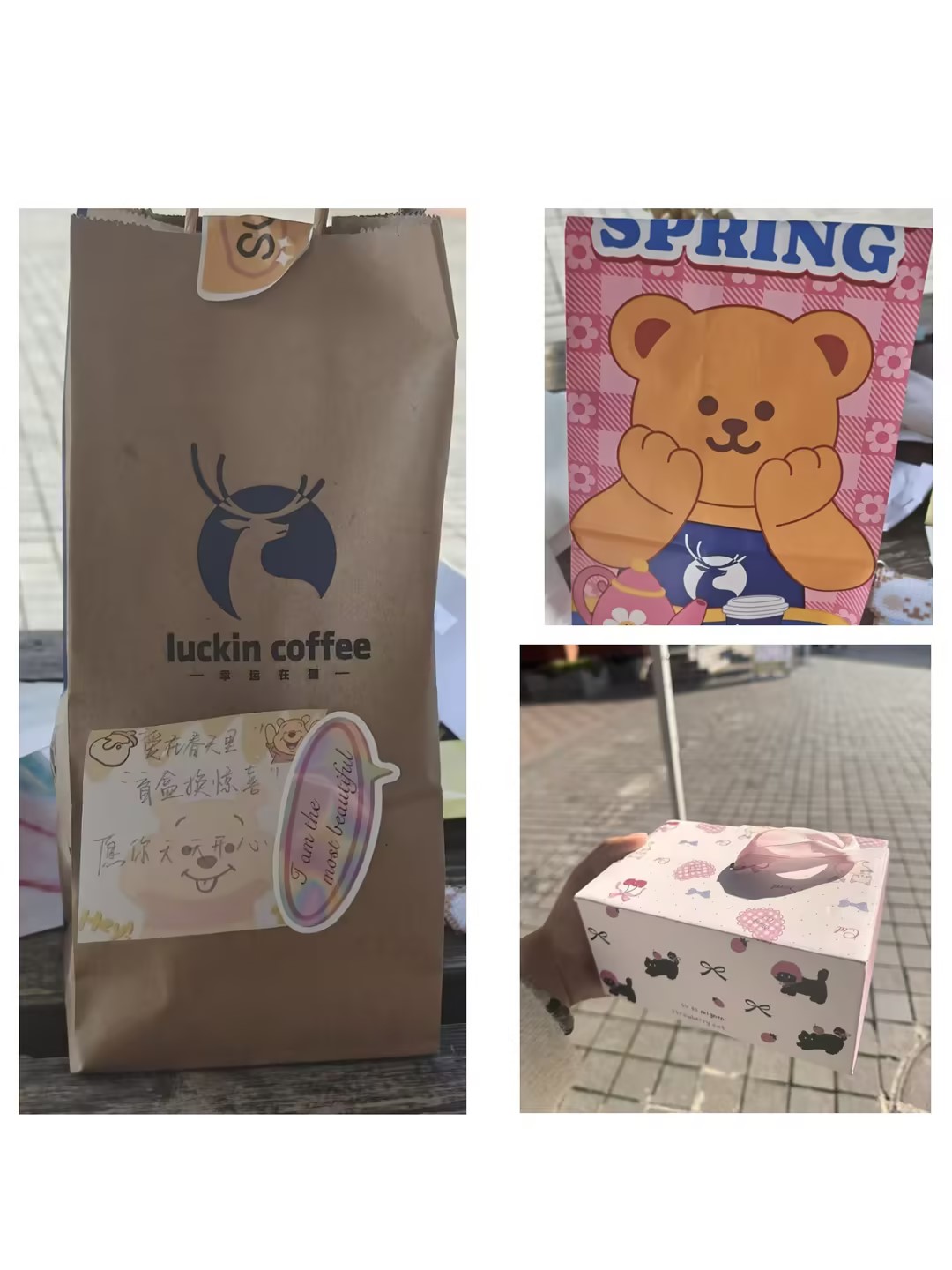 活动期间,在工作人员的引导下,同学们携亲手制作的盲盒陆续到场。盲盒形态各异、心意满满:有的以精致的铃兰礼盒盛装,系温柔丝带,尽显春日意趣;有的用牛皮纸折出栩栩如生的纸花,搭配手写“笔筒”字样的手工容器,手作温度十足;还有不少同学用彩纸、快递盒随性包裹,用简单的材料藏进满满的巧思。每一份盲盒中都装着手作、文具、小摆件等创意好物,承载着独一无二的心意。同学们随机交换盲盒,拆开未知惊喜,整个流程有序而充满趣味。现场洋溢着轻松愉悦的氛围,彼此的距离在一次次交换中悄然拉近。