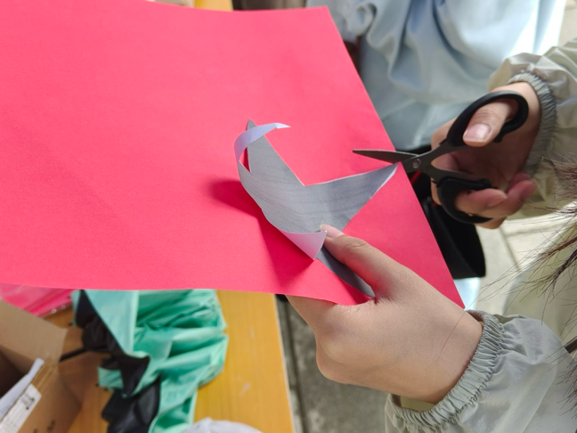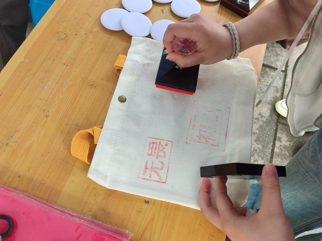 “青春绘英雄·文创藏初心”主题区域,包含英雄精神盲盒创作与非遗体验两项内容。盲盒创作区提供空白帆布袋、钥匙扣、徽章及彩笔印章,同学们执笔勾勒,绘五星、描红旗,以“无畏”“初心”朱印定格信仰;非遗体验区则准备剪纸底稿与篆刻橡皮章,巧手裁出展翅和平鸽,红屑纷飞如颂歌。画笔与剪刀成为理解英雄的另一种语言,徽章上歪斜的星芒、帆布袋上稚嫩的誓词,皆是青春初心的具象表达,让黄继光的英雄精神以文创为媒,扎根心底。