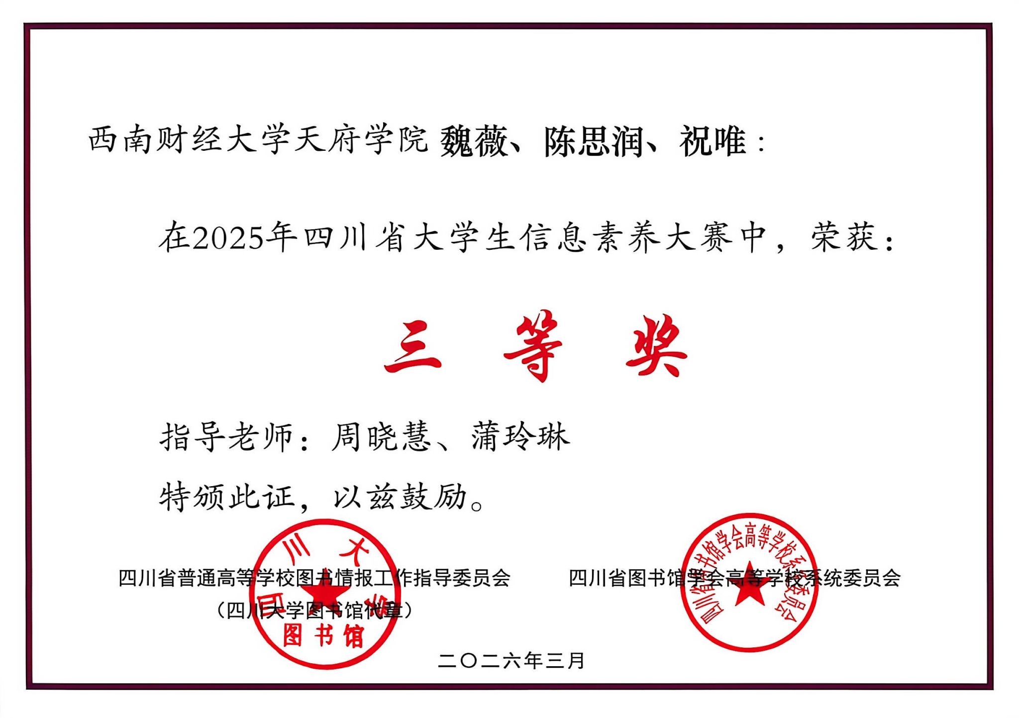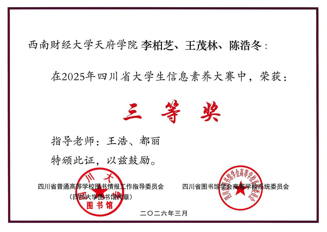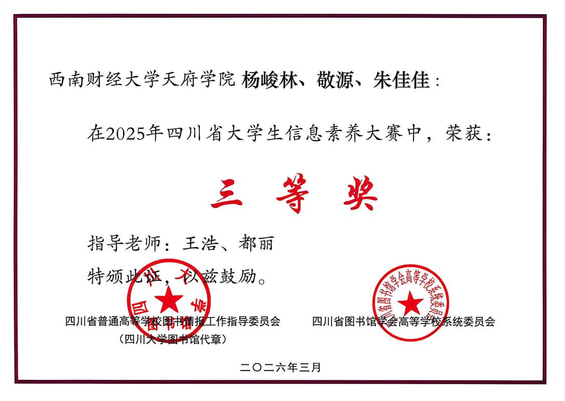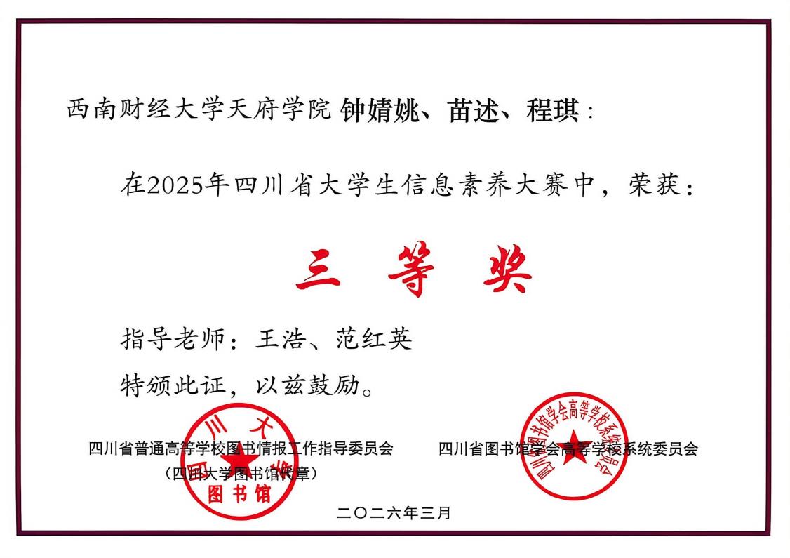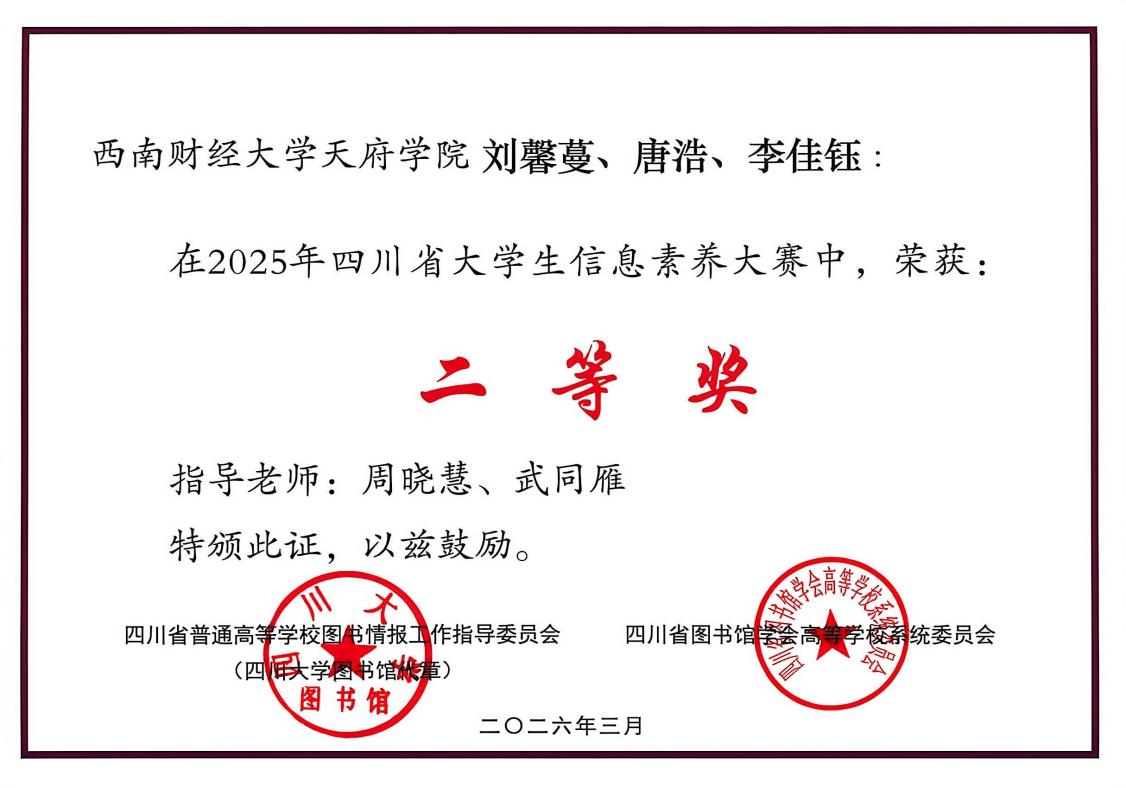 近日,由四川省教育厅、四川省普通高等学校图书情报工作指导委员会、四川省图书馆学会高等学校系统委员会联合主办的2025年四川省大学生信息素养大赛暨2025年大学生“AI+信息素养”大赛(四川赛区)评选结果揭晓,西财天府学院学子荣获佳绩。