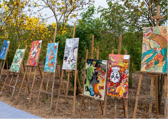 4月13日,同学们在老师的带领下乘车前往鄢家镇壁山村黄花风铃木观光园。在观光园,同学们带来精彩纷呈的文艺节目。双人合唱《我的未来式》激昂慷慨,唱出对未来的无限憧憬与坚定信念;藏舞《吉祥舞蹈》则以其独特的韵律和舞姿,展现浓厚的民族风情;独唱《你的答案》深情款款,表达对生活的热爱与坚持;而群舞《卿卿》更是将现场气氛推向了高潮,优美的舞姿和动人的旋律,赢得在场观众的阵阵掌声。本次活动还有艺术设计学院同学们带来的艺术展览和创意集市,艺术展览上一幅幅生动有趣的作品被当地居民连连称赞,创意集市中可爱的小商品也吸引着游览者的目光。