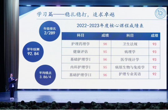 为充分发挥优秀学生的榜样示范作用,激发学生学习兴趣和对未来的探索欲望,11月8日晚,康养护理学院团总支、学生会学术部在成都校区(东区)学术报告厅开展“优秀学生分享会”。分享会由宋芮锐同学主持,学院党总支副书记陈雯,团总支、学生会指导老师李翰文、胡海鸿、蔺璟煜、郑仁敏,教师代表谢荟菊、廖诗沁、雍婷,辅导员代表俄木叶子、李蓝欣与学院2023级新生参会。
