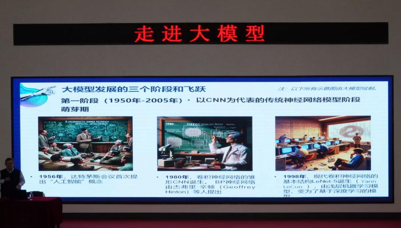赵才荣从人工智能的分类切入,梳理了大模型从1950年萌芽期的传统神经网络,到2006年探索沉淀期架构突破,再到2020年至今迅猛发展期的训练模型爆发的三阶段历程。赵才荣用详实的数据与生动的案例,勾勒出大模型技术从弱人工智能向通用人工智能迈进的清晰轨迹,让现场学子直观感受到科技迭代的速度与力量。讲座中,他特别解读了大模型在各个领域的应用实例,强调了数据、模型、算力三大核心要素的协同作用,以及技术发展背后学科交叉融合的重要性。