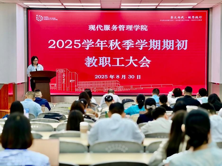 8月30日,2025年秋季学期开学之际,现代服务管理学院召开了期初教职工大会,全面部署新学期各项工作。会议由分党委副书记潘兰主持,分党委书记倪娅、院长罗珉、执行院长何亮、副院长高丹、院长助理佘脊、杜民帅在会上发言,学院全体教职工参加此次大会。