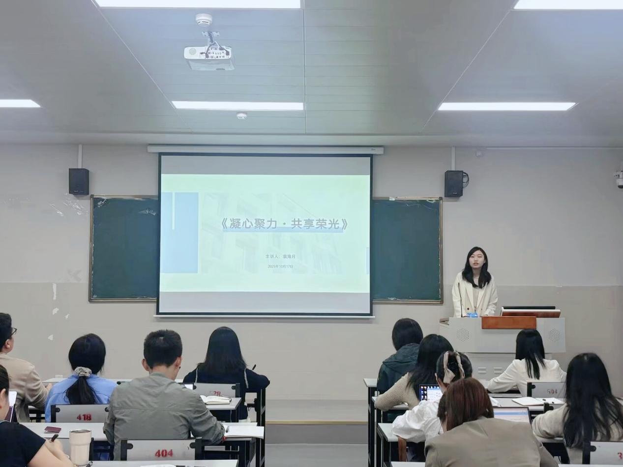 在经验分享环节,两位辅导员系统展示了如何将AI思维与方法融入班级管理的创新实践。辅导员袁海月以“凝心聚力,共享荣光”为主题,分享了班级管理经验。她通过每月举办主题班会、组织红色研学活动,以“主题学习+实践活动”模式强化思想引领。在日常管理方面,设立“五育”工作室,运用信息化平台辅助开展管理工作;在学风建设中,通过系统数据了解学生学业情况,分级实施帮扶计划,助力学习困难学生重返课堂。在突发事件处置方面,她总结出“理性沟通、工作留痕、及时联动”的有效做法,并积极探索应用AI技术分析学生数据,以提升研判精准度与干预效率。