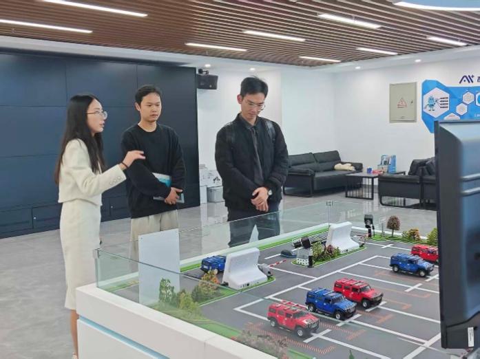 会后,产教融合中心卓芸为来访嘉宾讲解产教融合中心的实训教室、校企合作成果展示区等区域,展示基地在“教学—实训—服务”一体化建设方面的成果。