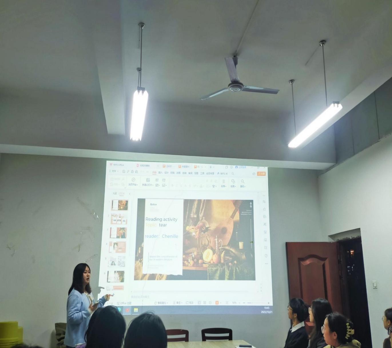 10月21日晚,由文化与教育学院E-star Club英语社主办的“Tear”主题朗读者活动在三教一楼讨论室顺利举行。活动特邀学院教师李欣现场指导,旨在激发同学们对英语朗读的兴趣,鼓励勇于表达自我。