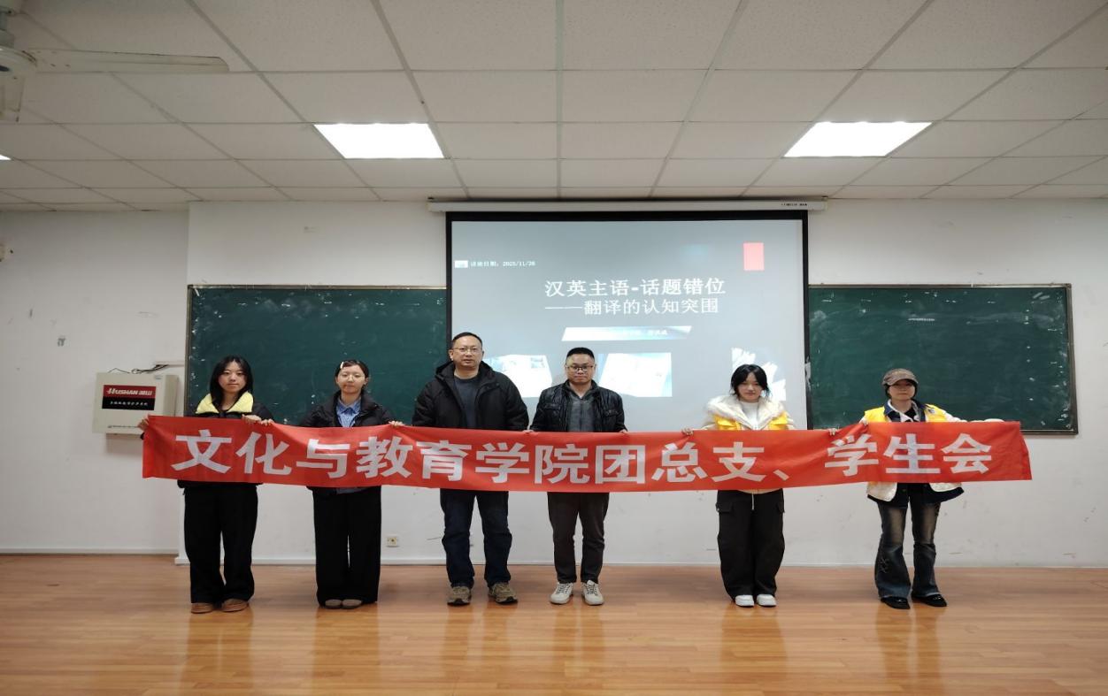 为帮助同学们深化对翻译的认知、提升跨语言实践能力,文化与教育学院学生会学术部携手文化与教育学院学生第二社区,于11月26日晚在二教2406教室举办了面向文化与教育学院全体学生的“汉英主语·话题错位”的专题讲座。本次讲座由文化与教育学院学生杨宇轩主持,文化与教育学院舒洪成老师领衔,文化与教育学院综合事务办公室副主任郑旭、团学彭金艳老师出席并分享。