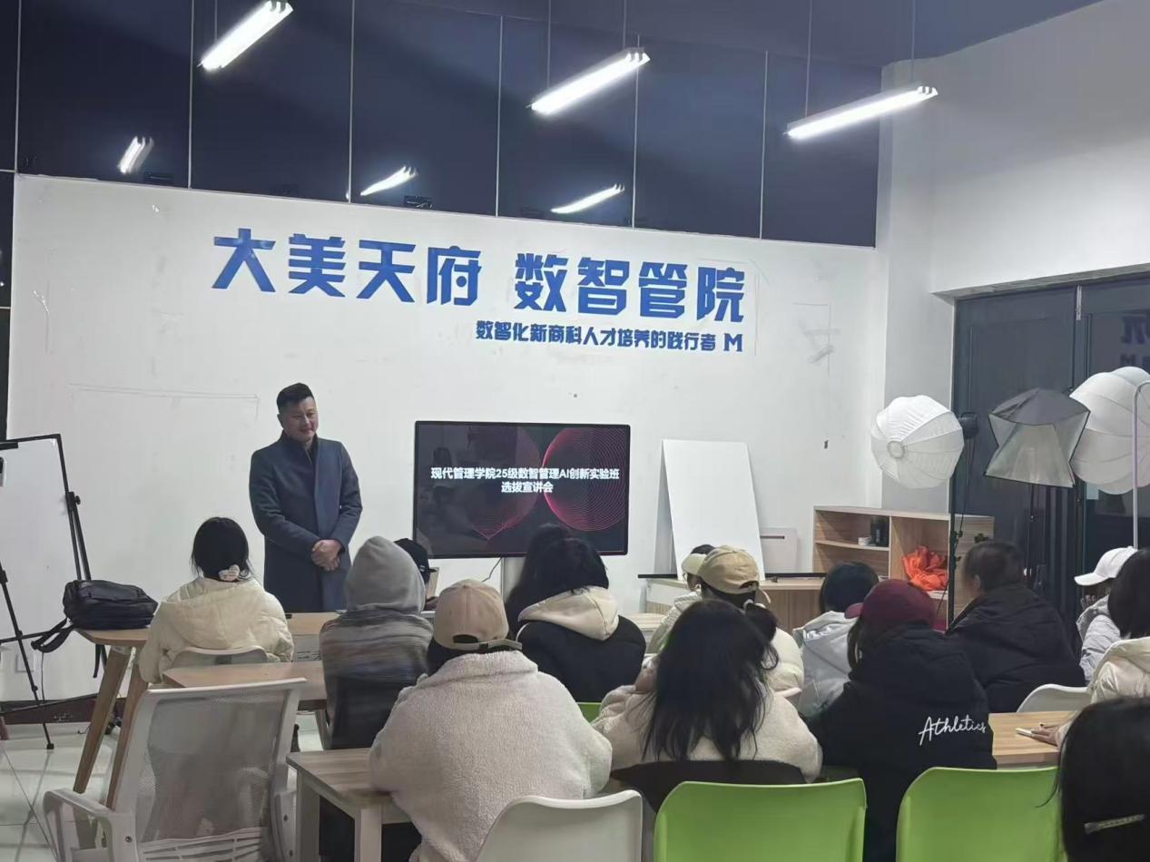 为深入贯彻落实学校AI赋能教育教学改革,12月1日晚,现代管理学院在B6-1教室举办数智管理AI创新实验班招生选拔宣讲会。本次宣讲会由学院院长助理杜民帅副教授主讲,2025级本科新生踊跃参与。