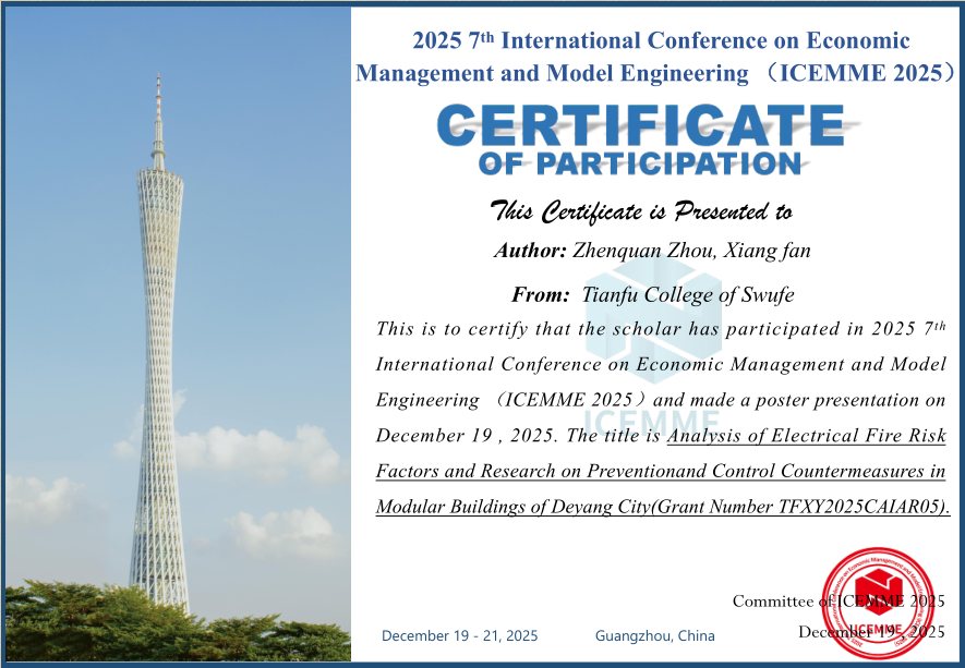 近日,2025年第七届国际科技创新学术交流大会暨经济管理与模型工程国际学术会议(ICEMME 2025)于12月19至12月21日在中国广州召开。本次国际学术会议由IEEE PES智慧楼宇及负载和客户支持系统卫星技术委员会(中国)等多家知名业界单位联合主办,旨在为来自国内外高等院校、科学研究所、企事业单位的专家、教授、学者、工程师等提供一个分享专业经验及展示研究成果的国际平台。工程与材料学院低空经济系主任周桢佺受邀参会并就主持的2025年西南财经大学天府学院建筑智能化应用研究中心校级专项课题项目《德阳市模块化建筑的电气火灾风险因素分析及防控对策研究》相关研究内容在本次学术会议进行了学术交流及海报展示,受到了业内学者和专家的高度肯定。