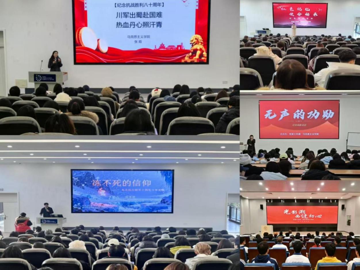 历史回溯板块同步开展专题讲座与主题观影。学院教师张霞前往德阳校区、成都校区(东区)开展“川军出蜀赴国难 热血丹心照汗青”主题讲座,讲解川军出川抗战的历史脉络和感人故事。学院教师沈玉进在德阳、绵阳校区开展《冻不死的信仰》主题讲座,讲解东北抗日联军十四年抗战历程和主要战役,感受东北抗联精神的科学内涵。学院在三校区分批次开展“红色记忆 使命传承”沉浸式主题观影活动,采用“影像叙事+思想交流”模式,以真实历史影像引发思想碰撞。《西迁壮歌》展现抗战时期知识分子守护典籍、坚守教育的峥嵘岁月;《穿越蘑菇云的人》彰显科研工作者攻坚克难、甘于奉献的精神;《无声的功勋(第二季)》再现阎宝航、李白等隐蔽战线英雄的感人事迹。