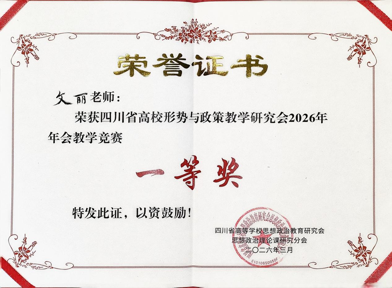 四川省高校形势与政策教学研究会2026年年会近日在川北幼儿师范高等专科学校举行。马克思主义学院教师文丽在比赛中荣获课程教学竞赛一等奖。