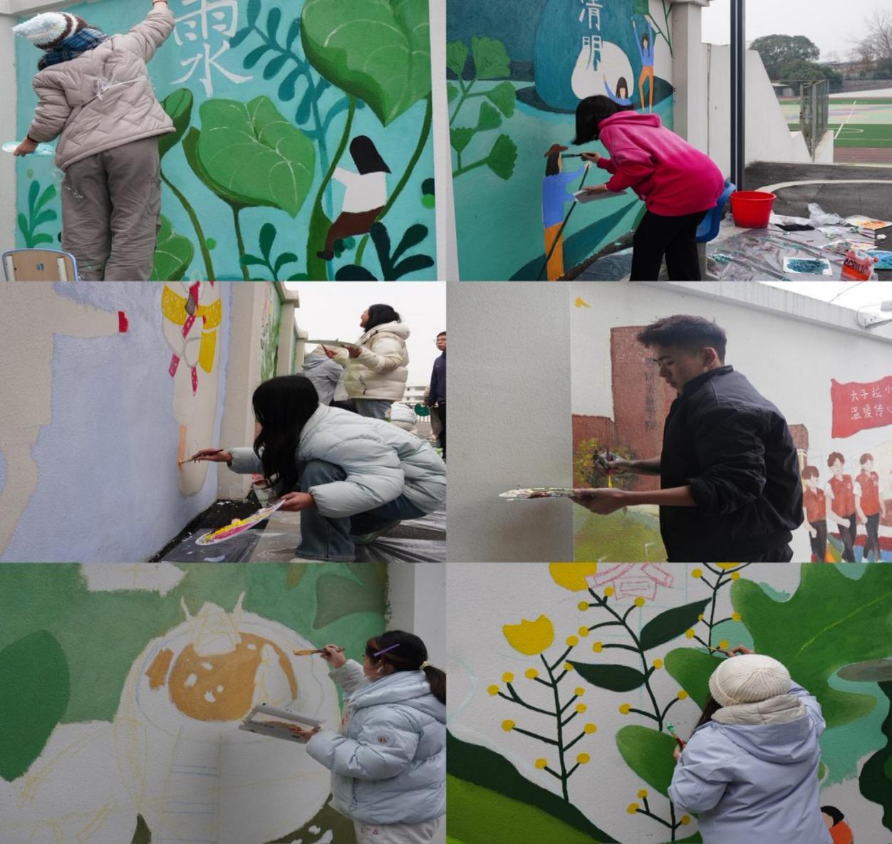活动伊始,西南财经大学天府学院组织的志愿者团队,在指导教师的带领下,携带专业绘画工具与设计图稿有序抵达鄢家小学。在活动过程中,志愿者们结合中华文化,参考支教活动中的二十四节气内容主题,对墙面进行了整体设计。从前期构图到后续调色、上色,志愿者们按照各自分工有序推进,彼此配合默契,将原本停留在纸面的设计一点点呈现在校园的墙面上。绘制过程中,志愿者团队在保证画面整体协调、美观的基础上,融入育人理念与中华文化元素,让作品在具备观赏性的同时,也传递出积极向上的价值内涵。整个活动推进顺畅、衔接紧密,志愿者们在实践中进一步锻炼了项目执行与团队协作能力,用实际行动展现出高校学子服务社会、以专业回馈公共空间的责任意识与担当。