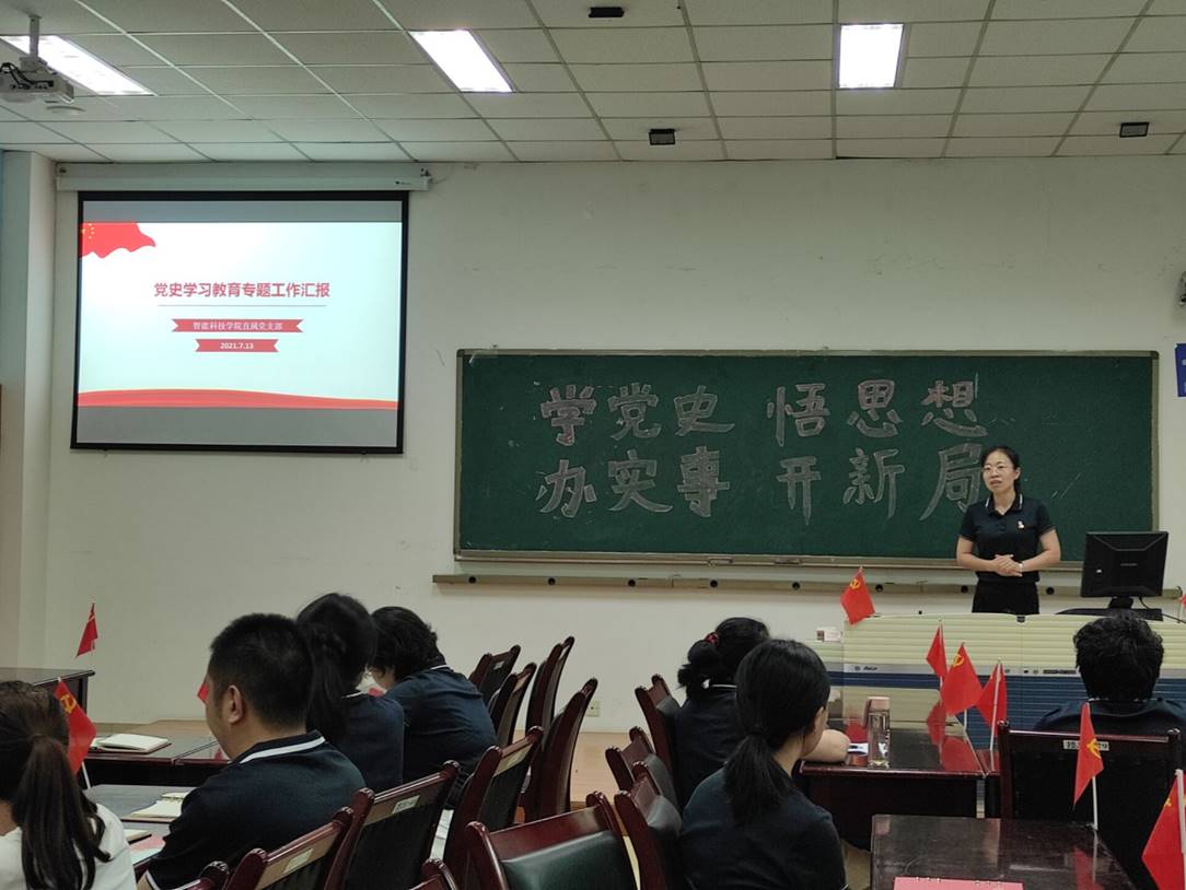会上,常荣首先汇报了智能科技学院直属党支部党史学习教育专题工作开展情况。她讲到支部开展党史学习教育工作的总体目标和要求,即始终以“十六字方针”为指导,深化党史学习教育工作,以“十二字要求”为目标任务,深耕立德树人内涵。