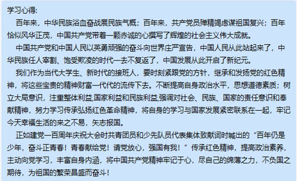 为响应国家疫情防控要求,做好防疫工作,本次活动采用分散学习的方式进行,同志们在宿舍、图书馆、操场、教学楼等各个地方进行线上学习。同志们克服客观条件的影响,认真学习领会发布会上中共中央总书记习近平作出的重要讲话。在线上学习后,同志们积极撰写心得体会,用文字记录下自己的感悟。夏雨欣同志表示:“作为新时代青年,我们要强化责任担当,勇于自我革命,传承红色基因,学好党史这本最生动最有说服力的‘教科书’,用好中国共产党历史展览馆这座‘红色基因库’,从我们党的百年历史中汲取坚实的智慧力量和丰富宝贵的经验。志存高远,忠于祖国,勇于担当、奋斗,传承发扬我们党的光荣传统和优良作风。”
