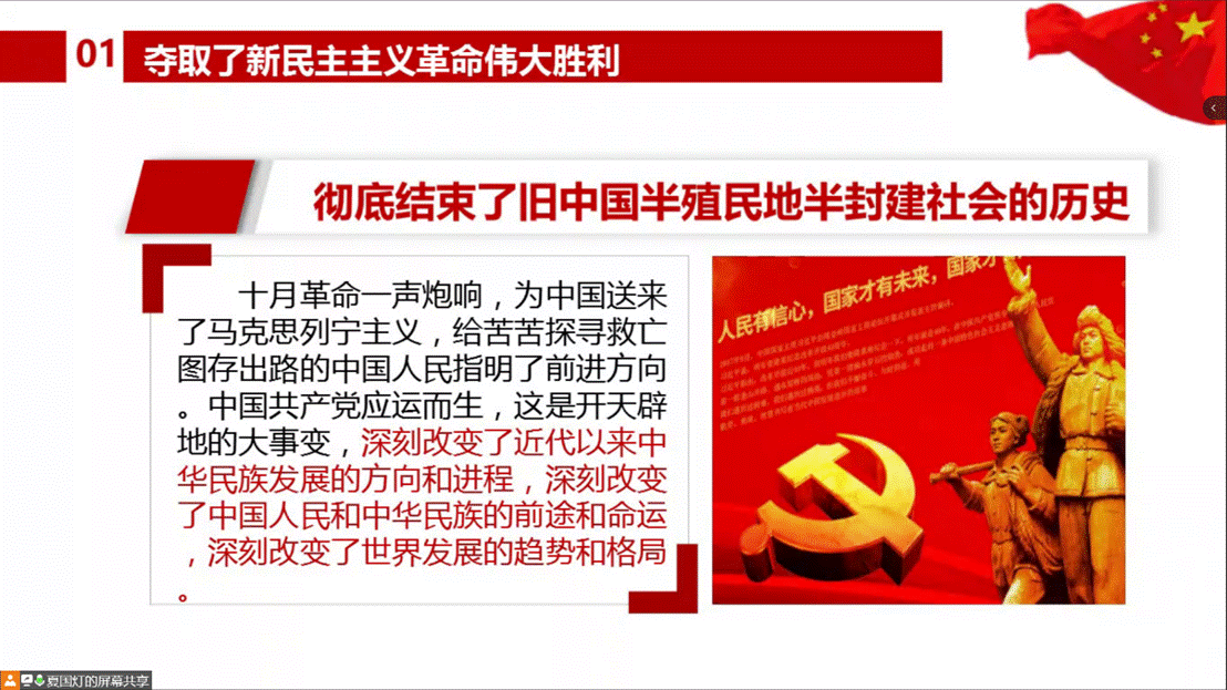 本次党课主要从“十九届六中全会会议概况”“党的百年奋斗的伟大成就”“党的百年奋斗的历史经验”等方面展开。会议伊始,夏国灯简单地介绍了十九届六中全会的会议时间、会议地点以及会议议程。紧接着,她详细阐述了党的百年奋斗取得的四大成就,在这百年奋斗历程中,通过浴血奋战、发奋图强,中国共产党创造了新民主主义革命的伟大成就,创造了社会主义革命和建设的伟大成就,创造了改革开放和社会主义现代化建设的伟大成就,创造了新时代中国特色社会主义的伟大成就,带领着中华民族迎来了从站起来、富起来到强起来的伟大飞跃,创造了中华民族发展史、人类社会进步史上令人刮目相看的奇迹。
