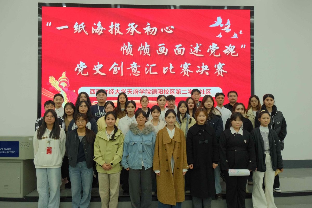 11月11日,西南财经大学天府学院德阳校区第二学生社区“一纸海报承初心,帧帧画面述党魂”党史创意汇比赛决赛在B101教室圆满落幕。决赛邀请了康养护理学院学生党建办公室指导老师陈心悦、郑仁敏以及辅导员代表王翰麟担任评委。决赛现场本次比赛以镜头述党史,以海报映初心,通过短视频与创意海报等形式,引导广大学子重温党的奋斗历程,赓续红色血脉。比赛自10月22日启动以来,吸引了全院学生踊跃参与,累计收到各类作品300余份。参赛者聚焦党史中的重要事件与英雄人物,...